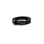 Cintura sottile realizzata in vera pelle con occhielli metallici distribuiti uniformemente lungo tutta la lunghezza. Il design è completato da una fibbia decorativa in metallo argentato dal carattere western, che aggiunge un tocco deciso e contemporaneo a qualsiasi outfit. Perfetta per valorizzare look casual o d’ispirazione vintage.